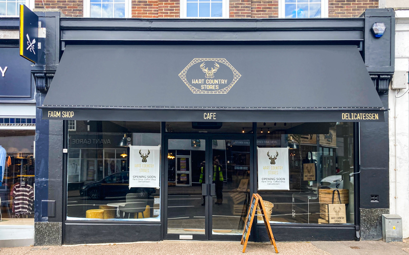 The combination of this Greenwich awning with branded, café barriers create a welcome introduction to the popular Claw restaurant in Seven Dials Market.