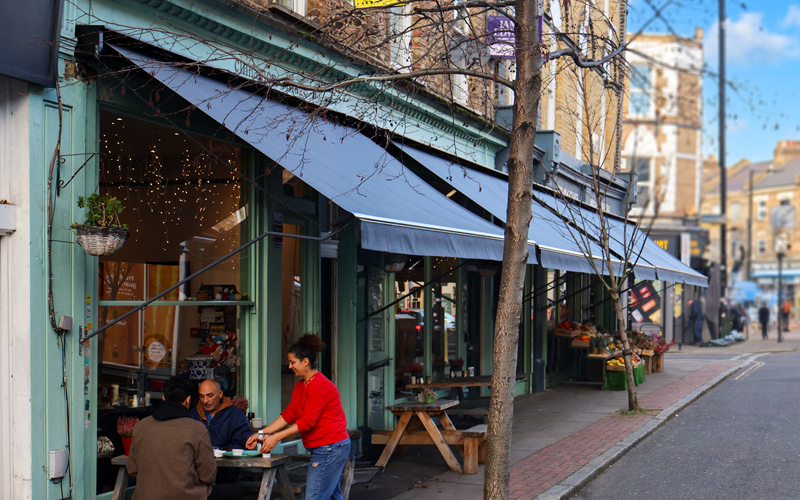 For Cinnamon Village Whole Foods & Deli on Blackstock Road, London, we supplied and installed five traditional Victorian Awnings to enhance both the shopfront and café frontage. Designed to work as a unified installation, the awnings create a sheltered, welcoming environment for customers while giving the business a strong and consistent street presence.